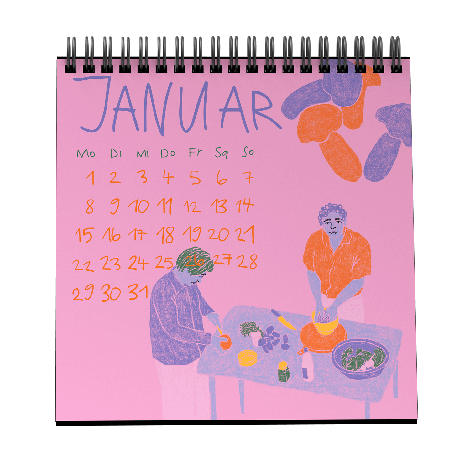 Sicher’ dir unseren Kalender für 2026, der dich jeden Monat mit den besten Rezepten aus unseren beiden Büchern begrüßt. Ob Shawarma, Tabouleh oder deftig Süßes …Beim Anblick dieser mit Feingefühl illustrierten Gerichte läuft dir das Wasser im Mund zusammen. Der einzigartige Stil von Lucy Rosali schafft es, mit sorgfältig angelegten Flächen, Mustern, Proportionen und Farbkombinationen die Aufmerksamkeit in die Tiefe zu lenken.